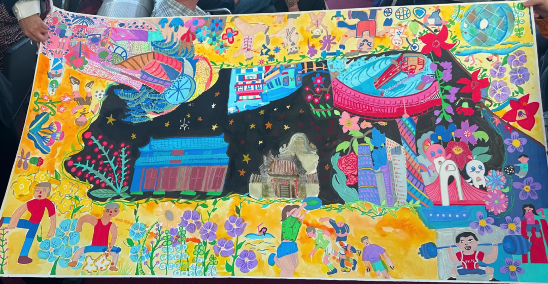 这幅由中法共创的画作长约1米,宽0.8米。作者共10人,年龄最小10岁,最大26岁,除3人是广州市少年宫美术部的普通孩子外,其余都是在该少年宫融合教育部接受长期培训,患有自闭症、唐氏综合症、智力障碍的特殊青少年。