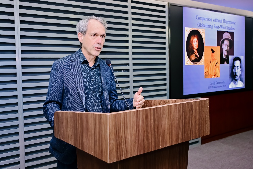 哈佛大学原比较文学系系主任大卫·达姆罗什教授发表主旨演讲。他从东西方戏剧演绎和期刊出版对现当代作家创作的影响出发,指出多元媒介的传播与译介促进了全球视野中世界文学的流动与互动,拓宽了比较文学的整体视野,使不同性别、阶级的声音共同参与世界文学的构建。
