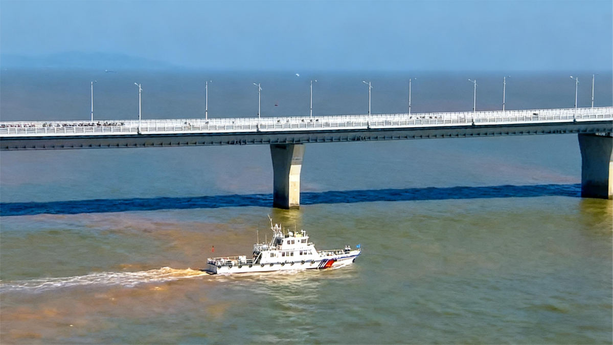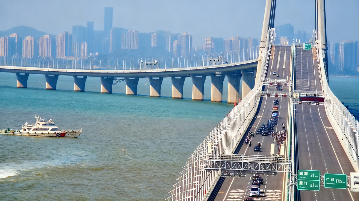 海巡船在港珠澳大桥水域护航自行车赛事举行