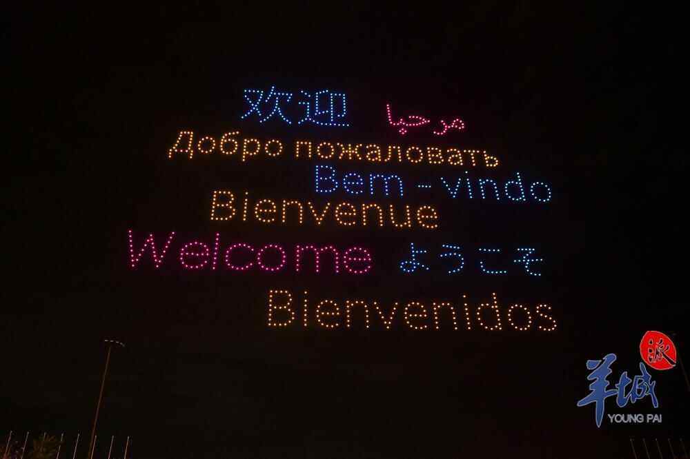 “欢迎”“Welcome”“Добро пожаловать”“Bem-vindo”12月2日晚,多架无人机飞上广州南沙的夜空,摆出“欢迎”的多语种字样,欢迎来自全球的媒体大咖。