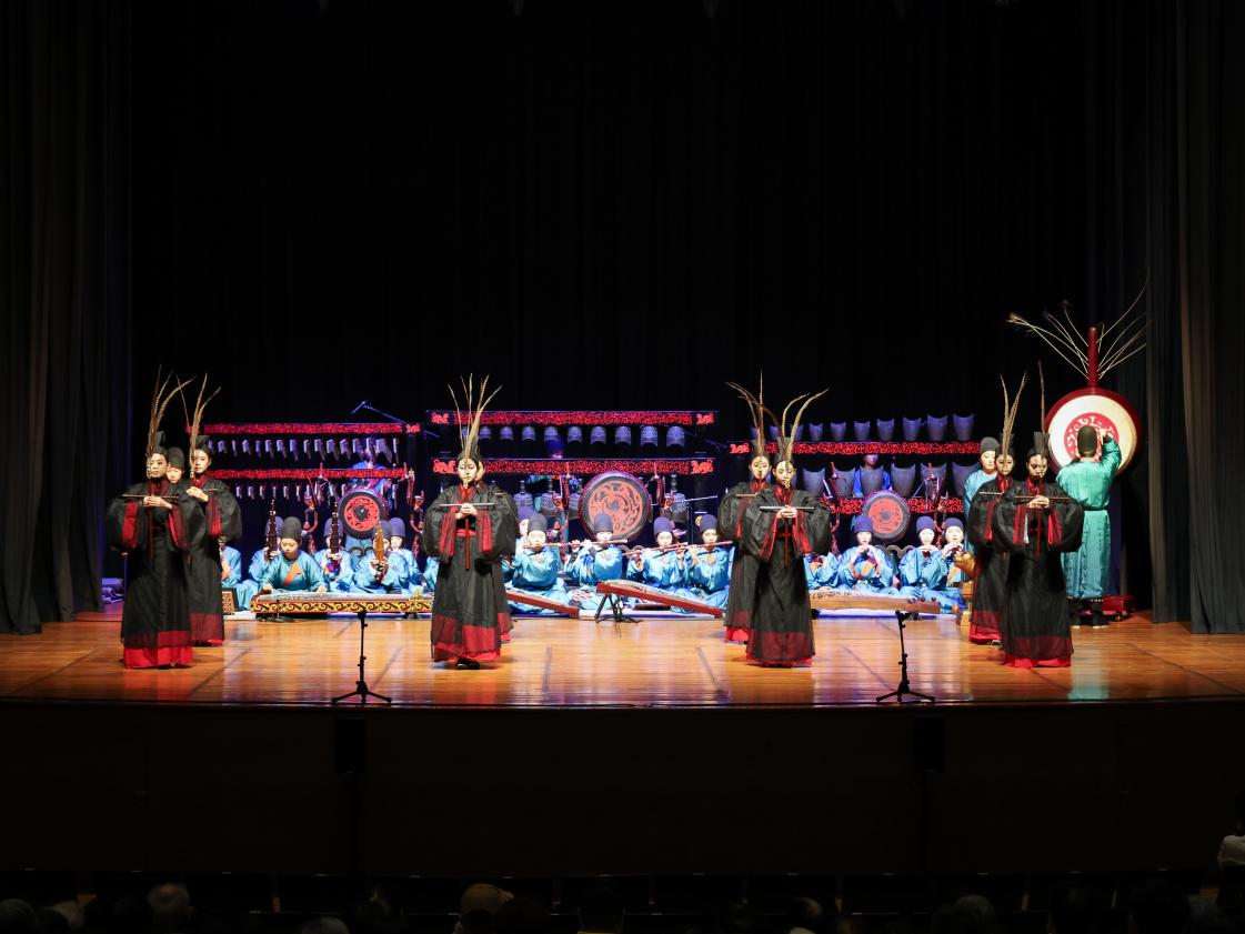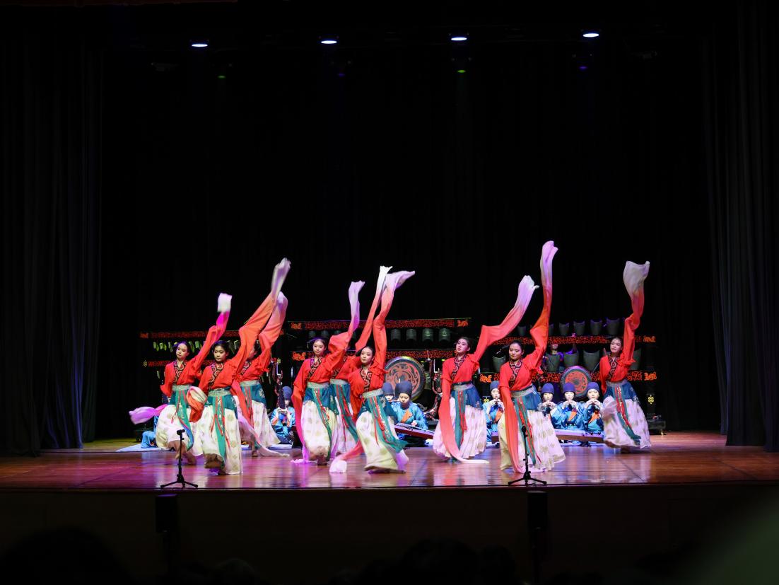 演出中,玉振金声雅乐团运用编钟、句鑃、建鼓等中国古代乐器,融合礼、乐、舞,呈现了《朝乐-文舞》《秋夜读易》《大濩》《建鼓迎宾》《楚商》《剑器浑脱》《望月婆罗门》《盈袖暗香来》《龙腾虎跃》九个精彩节目。此外,雅乐团总指导叶佳颖博士亲自登台进行导聆。通过生动细致的讲解,帮助观众在欣赏音韵之美的同时,理解其承载的人文精神。