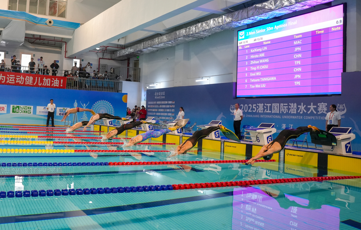 本次比赛的核心举办地——国家体育总局湛江潜水运动学校蹼泳馆,始建于1988年,于2017年完成重建,配备双恒温泳池与先进的计时、灯光等系统,全面符合国际赛事标准。为保障赛事顺利进行,湛江潜校与地方政府协同构建了完善的技术支持、医疗救援与安全保障体系,并联合高校志愿者提供多语言服务,满足参赛人员及观众需求。